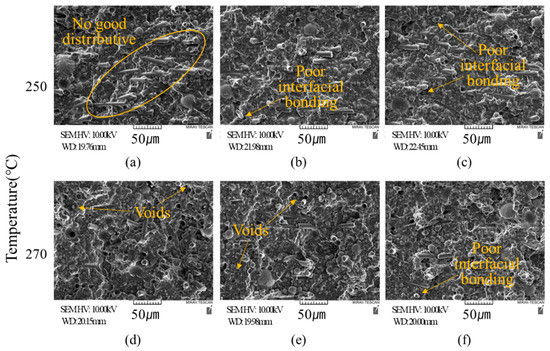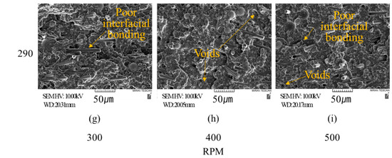 SEM images of the reinforced composites with various process parameters. (a) 250 °C, 300 RPM; (b) 250 °C, 400 RPM; (c) 250 °C, 500 RPM; (d) 270 °C, 300 RPM; (e) 270 °C, 400 RPM; (f) 270 °C, 500 RPM; (g) 290 °C, 300 RPM; (h) 290°C, 400 RPM; (i) 290 °C, 500 RPM.