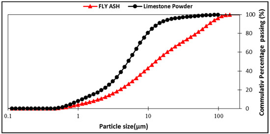 The Ordinary Portland Cement (OPC) Type-I, conforming to ASTM C-150/C-150M-15, was selected as a binder for both SCNWC and SCLWC specimens. In this study, Glenium51, liquid superplasticizer (SP) conforming to ASTMC494, was used, while the fly ash was Class F with an apparent specific density of 2.68 g/cm3. The LSP used in this research was grayish in color and rich in CaCO3 (97.64%). It was made sure that both SCMs were free from lumps prior to mixing. The fine aggregate used was natural sand obtained from the Lawrencepur region, with a fine modulus of 2.24. Normal weight aggregate, comprising of crushed angular stone, was obtained from Margalla crush for the current research work. Coarse aggregates were used in two sizes—particle size of 2–8 mm and 8–16 mm. The maximum size for the coarse aggregate was 16 mm, conforming to ASTM C33, with a specific gravity of 2.47 (2–8 mm) and 2.44 (8–16 mm). Some of the physical properties obtained through lab tests are listed in Table 1. The test results of aggregate gradation performed on coarse aggregate are shown in Figure 1. The crushed limestone was used as coarse aggregate in SCNWC, while expanded shale was used as coarse aggregate in SCLWC. Some of the essential chemical and physical properties are given in Table 2 and Table 1. The sieve analysis performed on the fine aggregate and coarse aggregate is shown in Figure 1. The density, specific gravity, and water absorption of sand were determined as per ASTM C128. The particle size distribution (PSD) of FA and LSP was done by granulometric laser analysis, and it showed that the D50 of FA and LSP was 5.83 µm and 14.3 µm, respectively (Figure 2). The mineralogy properties of FA, LSP, and expanded shale has been studied by X-ray powder diffraction analysis (XRD) (Figure 3).