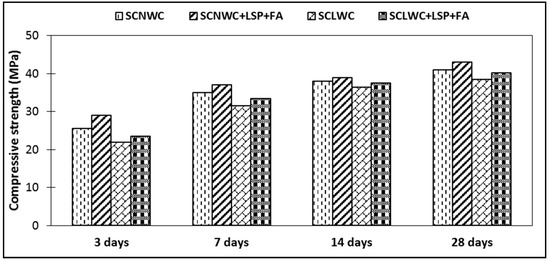 The compressive strength of SCNWC and SCLWC increased from 25 to 41 MPa and 23 to 40 MPa at 3-day and 28-day age, respectively. The mix design for SCLWC and SCNWC targets the same compressive strength. One can get SCLWC of the same quality as normal SCC if the appropriate amount of SP, VMA, and lower water binder (w/b) is used. Due to the replacement of cement with FA and LSP, the compressive strength increases. This is due to the pozzolanic and filler effect of SCMs. The w/c ratio played a significant role in enhancing the 28-day compressive strength. The homogeneity and unit weight of SCLWC also depends upon the w/c ratio. Strength improvement with SCMs is more pronounced in concretes with lightweight aggregate.