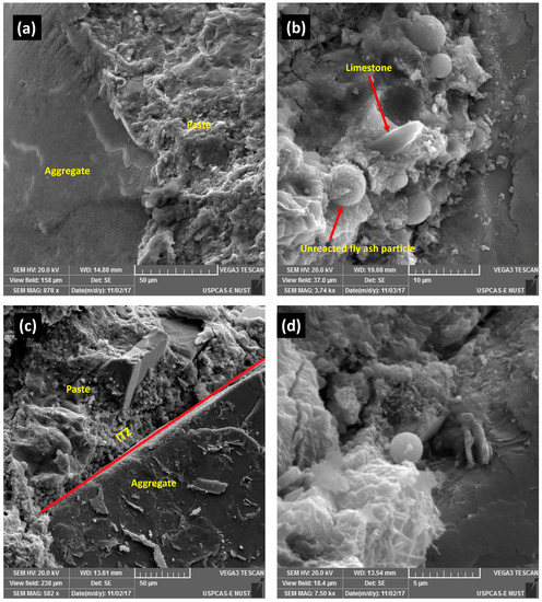 Figure 5 shows SEM images of SCNWC and SCLWC. The SEM images of the different concrete formulations were done to assess the porosity, ITZ, and microstructure qualitatively. The pozzolanic activity increases the hydration reaction and refines the microstructure of the concrete, which in turn enhances the concretes properties overall. FA and LSP incorporated specimens showed secondary hydrate formation as evident from the denser microstructure, which, thus, increased the compressive strength at later ages.