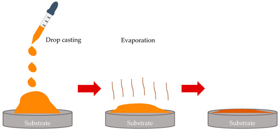 The prepared polymer solution, as described in Section 2.1., was casted by dropping onto the silicone oil-lubricated glass slide, as shown in Figure 1. The volume of the droplet was 30 µL. The process of drop-casting was carried under a temperature of 25 °C and relative humidity RH = 40%.