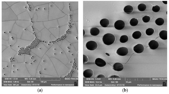 The change of the wetting regime resulted in the dramatic change of eventual patterns obtained with “dry” and silicone oil-lubricated substrates. The patterns arouse from the drop-casting on dry glass slides are shown in Figure 3. The large-scale pattern with a characteristic lateral scale of 50 µm was recognized in the SEM image, supplied in Figure 3a. The origin of this pattern has remained highly disputable; it has been related to the crack patterns [45] and also to the diverse instabilities occurring in the evaporated polymer solution [46,47,48,49,50,51,52]. In parallel, the honeycomb microporous patterns, typical for the breath-figures self-assembly, were observed, as shown in Figure 3b. The pores constituting the pattern were disordered and demonstrated high dispersion of their sizes.