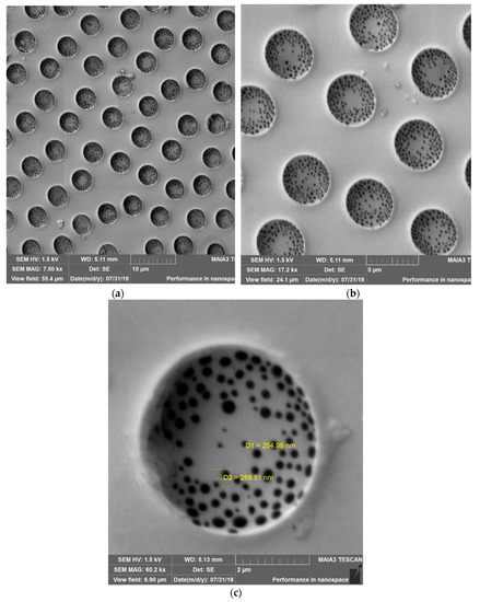 The topography of the samples was studied with the SWIFT M4000D optical microscope (Schertz, TX, USA) and ultra-high resolution MAIA3 FE-SEM device (TESCAN, Brno, Czech Republic)). SEM images were processed with the software SEM Image Porosity and Pore Size for MATLAB, enabling extraction of porosity and pore size distribution from SEM images [33]. The ordering of the pores was quantified with Voronoi tessellations performed with the moduli of the MATLAB program developed at the Department of Physics and Astronomy at the University of California