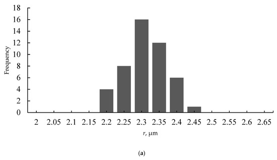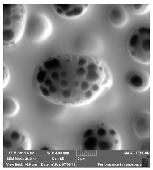 The situation changed dramatically when the polymer solution was deposited on the silicone oil-lubricated substrates, as shown in Figure 4a–c. The aforementioned large-scale pattern disappeared. The honeycomb microporous ordered pattern, depicted in Figure 4a–c, was observed. It should be emphasized that the pattern was hierarchical, namely small-scale nanopores were located within “large” micro-scaled pores, as shown in Figure 4b,c. The diameters of the nanopores were established with SEM as 100–300 nm. The presence of nano-scaled pores makes the reported films suitable for ultra-filtration. The formation of hierarchical porous structures under the breath-figures self-assembly has been addressed in Reference [12]. However, the precise mechanism of their formation remains obscure and calls for future investigations. Hierarchical porous structures were registered with both PS ( and the industrial grade PS, as shown in Figure 5. The size distribution of micro and nanopores, extracted from SEM images, is shown in Figure 6. The typical radius of micropores was established as 2.3 µm; in turn the typical diameter of nanopores was 125 nm.