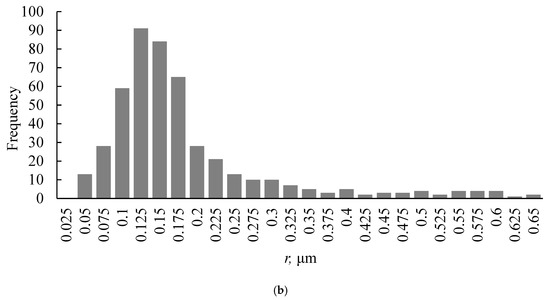 Pores size (radius) distribution is depicted. Typical numbers of pores possessing diameters confined within a given range appearing on the SEM images are supplied. (a) Large micropores size distribution extracted from SEM images is shown; (b) size distribution of nanopores is shown.