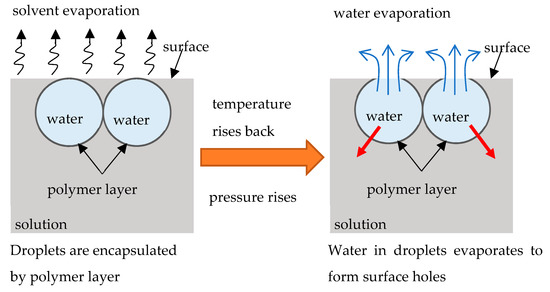 A reasonable question to be addressed is: what is the physical mechanism of the formation of the small-scale patterns, built of nanopores, shown in Figure 4b,c. Obviously, the formation of these pores could not be explained with the traditional “condensation”-inspired mechanism, introduced by investigators [14,15,16,17]. Perhaps, the formation of the nanopores obtains the explanation within the so-called “bursting hypothesis” introduced in Reference [53]. Ma et al. suggested [53] that at the early stage of the breath-figures process, the solvent is evaporated so fast that the temperature of the solution drops enough preventing the evaporation of water droplets. As a result, the polymer layer encapsulating the droplets is formed, as shown in Figure 7. After this, the temperature rises, the pressure within the micropores filled with water is increased, the polymer shell is burst and water is evaporated [53]. It is plausible to suggest that, at this stage, when the pressure within pores is increased, the water vapor disrupts the polymer shell encapsulating droplets in numerous points; thus, resulting in the formation of the nanopores, as shown in Figure 4b,c. The “bursting hypotheses” explains numerous experimental observations, reviewed in References [14,15,16,17]; however, this speculation of course calls for additional experimental justification.