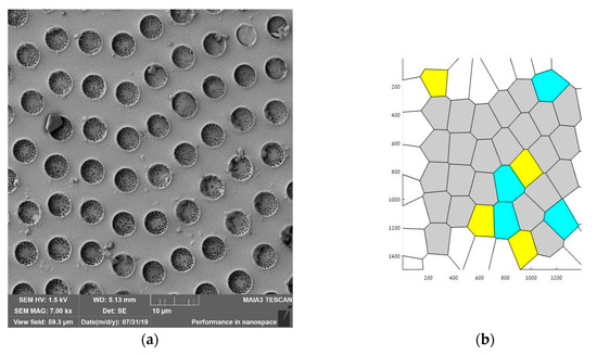 The SEM image of the honeycomb pattern (a) and the appropriate Voronoi tessellation (b) are shown. The calculated Voronoi entropy Svor =0.736. Grey polygons are hexagons, yellow polygons are pentagons and blue polygons are heptagons.