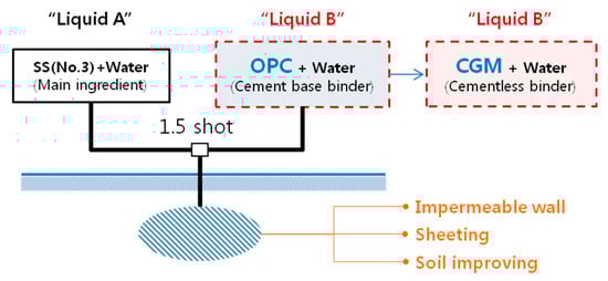 Soil-improvement methods were first developed in England in 1962 with jet-grouting methods to improve retention walls []. Currently, there are a number of studies on the development of these methods to resolve various geological engineering issues []. The injection and grouting method is a typical soil-improvement method based on injecting a chemical liquid grouting material (CLGM) into the soil to improve it according to certain performance requirements. This method is widely used for earth-retention purposes and, occasionally, for the purpose of soil hardening. Among the materials that compose CLGM, sodium silicate number 3 (SS No. 3) is typically used for “Liquid A,” which is the main ingredient responsible for setting, and ordinary Portland cement (OPC) is used for “Liquid B,” which acts as the binder.