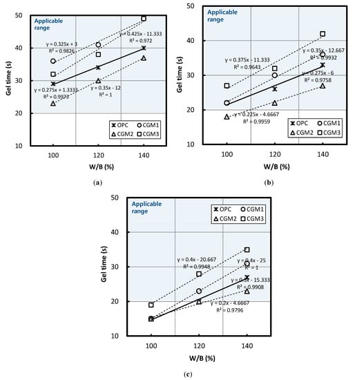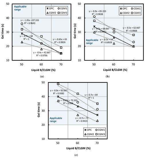 Gel time based on water/binder (W/B) ratio of Liquid B for Liquid B/CLGM equal to (a) 50%, (b) 60%, and (c) 70%.
