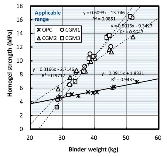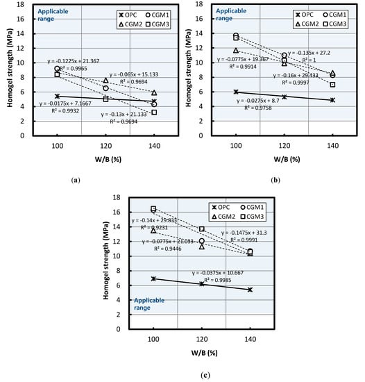 Based on an examination of the applicability range of the W/B ratio of Liquid B that could improve homogel strength in comparison with that of OPC, we observed that CGM 1 improved homogel strength at 135.2% or less, CGM 2 at 167.7% or less, and CGM 3 at 124.1% or less.