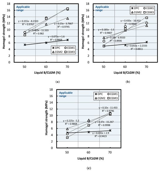 Based on an examination of the applicability range of the volume ratio of Liquid B that could improve homogel strength relative to that of OPC, we observed that homogel strength could be increased by 50.3–100.0% for CGM 1, 42.6–100.0% for CGM 2, and 54.2–100.0% for CGM 3.