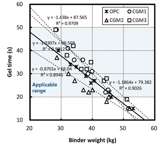 On the other hand, we observed that the applicability range of binder weight that could reduce gel time relative to that of OPC was impossible in CGM 1 and 3, whereas CGM 2 could reduce gel time by 9.2–43.7%. Furthermore, the applicability range of binder weight that could improve homogel strength relative to that of OPC was 27.4 kg or more for CGM 1, 20.4 kg or more for CGM 2, and 30.2 kg or more for CGM 3.