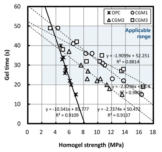 Furthermore, within the range of gel times below 43.2 s, the homogel strength of the CGMs was greater than that for OPC at an identical level of gel time. At a homogel-strength range above 4.04 MPa, the gel time of CGM was lower than that of OPC. All specimens that were manufactured according to the mixing experiments developed in this study exceeded the target homogel strength of 2 MPa; however, five specimens (four CGM and one OPC specimen) were not within the target gel time of 20–50 s.