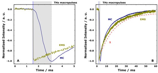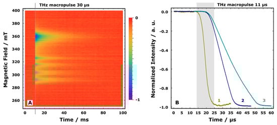 3.3. Studying the Spin Dynamics Induced by High-Power THz Macropulses of ~30 µs Duration