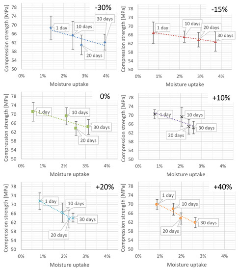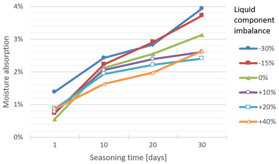 The control group, unexposed to Ringer’s solution, was seasoned in the air at 23 °C. The specimens seasoned in Ringer’s solution were weighed after 1, 10, 20, and 30 days of manufacture. Prior to the measurement, all visible residues of the solution were removed from the surface of the samples using a paper towel. The moisture uptake was estimated as the ratio of sample weight gain to the initial weight. The measurements were carried out for an average of approximately 9 samples. The final result is the arithmetic mean of all moisture uptake results within a series.