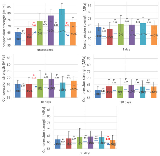 In addition, an equality test of paired samples was carried out for compressive strength of cement specimens formed at incorrect P/L ratios under various seasoning times in Ringer’s solution. In Table 2 below, red colour denotes the results whose statistical analysis indicates the inequality of means. The average differences between the compared strength values are given in brackets.