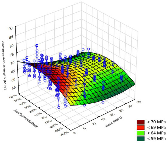 The results above have been compiled into a surface plot (Figure 4), which collectively shows the interrelations between the three parameters under scrutiny, i.e. the exposure time of specimens to Ringer’s solution, the cement mass mix ratio imbalance, and the resulting average compressive strength of the cement material. The estimation of the non-linear model takes the following Equation (1):
