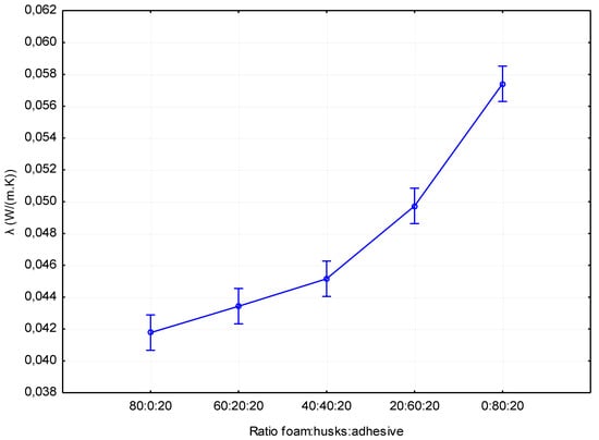Figure 2 shows the results of the thermal conductivity coefficient (λ). The results show that the overall thermal conductivity coefficient increased with increasing husks, which also corresponds to the density of the individual materials. The best variant was therefore the type of boards without added husks (λ = 0.0418 W/(m.K)). Boards with 20% husks achieved higher values on average by 3.83% (λ = 0.0434 W/(m.K)) compared to the variant without added husks. For boards with 40% husks, higher values were measured relative to the reference board by 8.13% (λ = 0.0452 W/(m.K)). From a statistical point of view (Table 4), it can be stated that there is no statistically significant difference between variants without added husks and with 20% husks. The same is true for boards with 20% versus 40% husks. For materials with a higher proportion of husks than foam, the thermal conductivity coefficient increased significantly. For material with 60% husks, an increase in value relative to the reference material by 18.9% (λ = 0.0497 W/(m.K)) was recorded. For material made up of husks only, the measured values reached an average of 37.32% (λ = 0.0574 W/(m.K)) higher value relative to the reference material. The described trend is closely related to the density of the individual variants, in general the thermal conductivity coefficient decreases with the decrease of the foam density down to ca. 80 kg/m3 [18,19]. Increasing the proportion of husks in the composition of the material significantly increases the coefficient of thermal conductivity; nevertheless, this material is comparable to other commonly used materials such as cork boards, c-flute panels, etc. [20]. The measured thermal conductivity coefficients are comparable to commercial wood fiber heat insulation boards, for example, from Steico company.