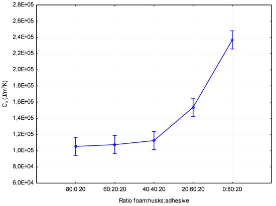 A similar trend to that of the thermal conductivity can also be seen in volumetric heat capacity. This trend can be seen in Figure 3. The lowest volumetric heat capacity values were measured in materials without added husks, and with 20% and 40% husks added. There was no statistically significant difference between these materials (Table 5). However, it was found that as the volume of husks in the boards increases, the volumetric heat capacity also increases. For boards with 20% husks (Cp = 0.108 MJ/m3K), an increase in values was recorded relative to the boards without husks (Cp = 0.105 MJ/m3K) at an average of 2.86%. For boards with 40% husks (Cp = 0.113 MJ/m3K), relative to the boards without husks, an increase in values was recorded at an average of 7.62%. For boards with 60% (Cp = 0.154 MJ/m3K) and 80% husks (Cp = 0.237 MJ/m3K), the increase was statistically significant. For boards with 60% husks, relative to the boards without added husks, the increase was at an average of 46.67%, and for boards with 80% husks, the increase was at an average of 125.71%. The measured volumetric specific heat capacities of the board without added husks correlates to the results specified in the work of Incropera et al. [21]. Boards containing husks had generally higher values of volumetric heat capacity with an increasing proportion of husks in the board. However, boards containing 80% husks achieved much lower volumetric heat capacity values than boards from the husks specified in the work of Czajkowski et al. [22]. The reason for this difference may be a difference in the density of the boards (Table 3).