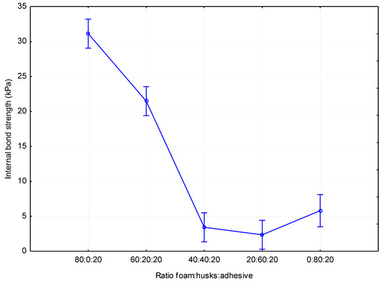 The results of internal bond strength are shown in Figure 4. The highest values were measured for boards without added husks (31.1 kPa) and with the increasing number of husks, internal bond strength also decreased significantly, but this drop was only true for boards with less than 40% husks. There was no statistically significant increase or decrease in values from this threshold (Table 6. Compared to the boards without husks, boards with 20% husks (21.5 kPa) decreased on average by 30.87%. Compared to the boards without husks, in boards with 40% husks (3.4 kPa), the decrease was at an average of 86.17%. Boards with 60% husks (2.3 kPa) showed a decrease at an average of 92.60% and boards with 80% husks (5.8 kPa) showed a decrease in values at an average of 81.35%. Due to the fact that the internal bond strength of boards with a higher proportion of husks and higher density was lower than for boards with significantly lower density, it can be stated that the interaction of the adhesive, foam, and husks significantly negatively affects the internal bond strength values. This trend is explained by the diametrically different adhesive properties of foam and husks. With an increasing proportion husks, the internal bond strength values stabilized at values corresponding to boards consisting of 80% husks. Similar results were achieved in the work [23]; however, wood fibers were used in this work. If we compare our result with high density binderless insulation boards made from coconut husks and bagasse in work [24], it can be seen that results in this work are very similar. It follows that it is possible to produce an insulation material only from husks without adhesive, but at the expense of higher board density.