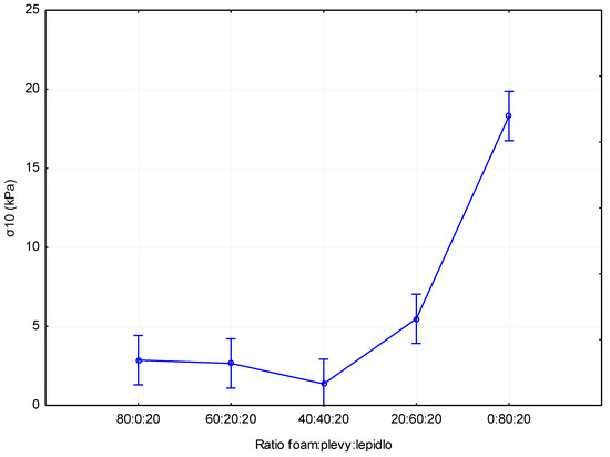The results of the compressive stress at 10% stress can be seen in Figure 5. From these results, there is an apparent trend of increasing stress at 10% strain with increasing husks content. The highest stress values were measured for boards with 80% husks (18.3 kPa). Boards without husks (2.9 kPa) achieved lower values relative to boards with 80% husks at an average of 84.15%. Using the statistical evaluation in Table 7, it can be seen that there was a statistically insignificant difference (for boards with 60% and 40% husks, there was a slight statistically significant difference) between boards without husks and boards with up to 60% husks. Boards with 20% husks (2.7 kPa) achieved lower values relative to the boards without added husks on average by only 7.41%. Boards with 40% husks (1.4 kPa) achieved lower values compared to boards without husks at an average of 51.72%. Adversely, boards with 60% husks (5.5 kPa) achieved higher average values compared to the boards without husks by 89.66%. These results are comparable to those specified in the work [25]. This work dealt with bio polyurethane foams. However, there were significant differences in board density between our materials and those presented in this work.