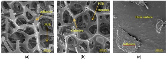 The microscopic images in Figure 7a–c show the observed characters of rupture in the material after the tensile strength test perpendicular to the plane of the board. Both adhesion errors and cohesion errors were observed. Adhesion failure occurred when the husks and PUR particles came into contact (Figure 7a,c). Cohesive failure occurred in PUR particles (Figure 7b). The separation of the adhesive from the particle surface is an undesirable phenomenon in the composites—in our case it is caused by waxy substances on the surface of the husks and this adhesion error could be eliminated by a suitably chosen surface pre-treatment [8].
