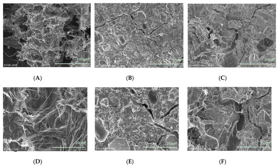 Figure 1 presents representative SEM images of STAR, control GIC, and 8 wt.% STAR-containing GIC samples after the flexural strength test, revealing the presence of innumerable irregular STAR fiber aggregates with a net-like structure (Figure 1A,D). The average aggregate had a size of ~100 µm and contained multiple air layers. Compared to the control GIC (Figure 1B,E), the 8 wt.% STAR-containing GIC featured numerous fibrous aggregates in its matrix layer (Figure 1C,F). The GIC matrix penetrated the STAR aggregate, and the original pre-addition form could be observed only in parts of aggregate tips.
