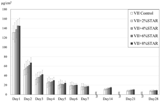 Table 1 summarizes the mean flexural, compressive, and diametral tensile strengths (with the corresponding S.D.s) obtained for the control and STAR groups. The flexural strengths of 2, 4, 6 and 8 wt.% STAR-containing GICs significantly exceeded that of the control GIC (t-test, p < 0.05). Similarly, the compressive strengths of 4, 6 and 8 wt.% STAR-containing GICs significantly exceeded that of the control GIC (t-test, p < 0.05). Finally, the diametral tensile strengths of 6 and 8 wt.% STAR-containing GICs significantly exceeded that of the control GIC (t-test, p < 0.05). Notably, STAR loading had no significant effects on the flexural, compressive, or diametral tensile strengths (Tukey’s test, p > 0.05).