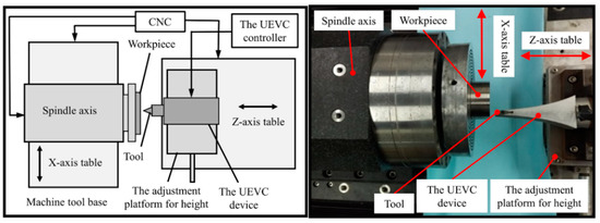 In the experimental setup, a typical titanium alloy Ti-6Al-4V alloy, was chosen. The physical properties of Ti-6Al-4V alloy are listed in Table 1. The workpiece is held by the vacuum chuck attached on the spindle of the home-made ultra-precision machine tool, as shown in Figure 3. The machine tool mainly consists of an aerostatic spindle and two horizontal hydrostatic slideways. The UEVC device was positioned on the z-axis, and the high-precision adjustment platform was used to achieve the height adjustment of the UEVC device. It should be noted that the UEVC device could be considered as a traditional tool holder when it was not powered. The samples were round pie with the diameter of 50 mm and the height of 20 mm. The pre-turning was first completed with the CC process. Following this, a series of micro-groove machining experiments under different machining conditions were carried out. The experimental conditions and cutting parameters are listed in Table 2.