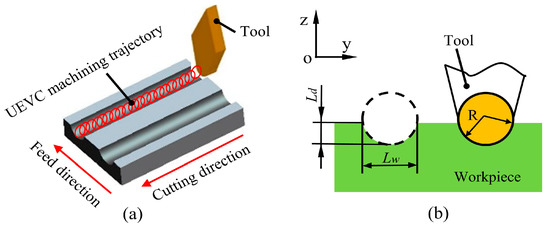 As shown in Figure 2a, the cutting tool elliptically vibrates in the xoz plane, which is formed by the nominal cutting direction (i.e., x-axis) and the chip flow direction (i.e., z-axis). Relative to the workpiece, the transient position of the cutting tool can be described as follows: