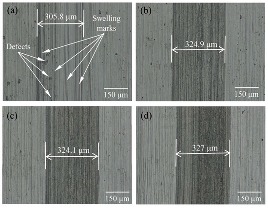 In the micro-groove machining of titanium alloy, the suppression of material swelling and springback is crucial. To evaluate whether the UEVC technology, especially at different TSR, meets to suppress the material swelling and springback, the machining quality assessment of the machined micro-grooves is respectively performed by ultra-depth 3D microscopy system (VHX 1000E; Keyence, Osaka, Japan) and a white light interferometer (NewView 5000; Zygo, Middlefield, CT, USA). The machining quality of the micro-grooves with the predetermined depth of cut of 8 μm produced by different processing methods was first analyzed. Figure 5 shows the micrographs of the generated micro-grooves. As shown in Figure 5a, the clear, obvious and straight swelling marks appeared on the bottom and the side of the micro-groove produced by the CC process. Numerous surface defects were randomly distributed on the finished surface. On the contrary, the machined surfaces of the micro-grooves were clear and smooth, with no surface defect and swelling marks under the UEVC process with different TSR, as shown in Figure 5b–d. These facts implied that the material swelling and springback effect was very obvious in the generated micro-groove produced by CC, and the material swelling and springback effect was obviously suppressed by using the UEVC technology. The underlying reasons could be explained by analyzing the basic function mechanisms of the UEVC technology. As discussed in Section 2.1, the intermittent cutting and the reduction of instantaneous cutting thickness existed in the UEVC process, which caused small cutting forces and resulted in little cutting heat. Furthermore, the reversed friction force led to the increase of the nominal shear angle, so the cutting forces and friction force could be further reduced. On the other hand, the intermittent cutting mechanism provided a more favorable heat dissipation condition. Thus, the cutting temperature in the UEVC process was far lower than the CC process, which resulted in the prominent reduction in the level of material swelling and springback during the processing of micro-grooves on titanium alloy.