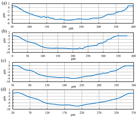 The reduction in the level of material swelling and springback was directly reflected in the dimensional parameters of the generated micro-groove. As displayed in Figure 5, the width of the micro-groove machined by the CC process was 305.8 μm, while the width of the micro-grooves machined by the UEVC process with different TSR were 324.9 μm (TSR = 1/12), 324.1 μm (TSR = 1/24) and 327 μm (TSR = 1/48), respectively. These implied that, during the processing of the micro-groove on titanium alloy using the CC process, the side swelling and springback effect was obvious and it introduced the larger volume of the material at the groove side, therefore, the width of generated micro-groove was smaller than the designed one (329.3 μm). During the processing of the micro-groove on titanium alloy using the UEVC process with different TSR values, the deviation values in the micro-groove width were small. The experimental results were all closed to the designed value. In order to further study the details of the generated micro-grooves, the cutting profiles were analyzed, as shown in Figure 6. Due to the effect of material swelling and springback, the ragged profile with wavy and vibration characteristics was obtained, as shown in Figure 6a. The depth of the micro-groove produced by the CC process was 6.4 μm, and it was much less than the designed value (8 μm), which indicated that a significant bottom swelling and springback appeared on the bottom surface of the generated micro-groove. Furthermore, the shape of the cutting profile was even distorted, and deviated largely from the tool shape. Thus, in the CC process, the actual parameters of the generated micro-groove greatly strayed from the designed parameters. In contrast, as shown in Figure 6b–d, the cutting profiles of the generated micro-grooves produced by UEVC process with different TSR displayed a smooth radius curve, and the depths were all close to 8 μm. It is worth noting that as the TSR value decreases, the cutting profile appears smoother. The cutting profile of micro-groove machined by the UEVC process with TSR = 1/48 has a few ripples and vibration marks.
