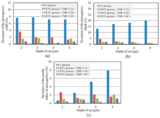 As can be seen from Figure 7c, it is clear that, in the CC process, the deviation of the profile radius of the machined micro-groove rapidly increased with the increase of the predetermined depth of the cut. However, since the UEVC technology has a good suppression effect on the material swelling and springback in both of the side and bottom during the micro-groove machining of titanium alloy, the deviations of the profile radius of the micro-groove were small for all predetermined depths of the cut. It is worth noting that, for the UEVC process with TSR = 1/48 or TSR = 1/24, the deviations of the profile radius of the micro-groove were smaller than 2%. This indicated that the accuracy of the machined micro-groove could be ensured during the processing of the micro-groove on titanium alloy by using the UEVC process.