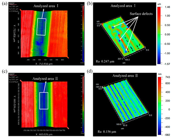 Surface integrity is an important indicator for evaluating the machined surface quality and has a large impact on the reliability and service life of the part. Figure 8 shows the surface topography views of the machined micro-grooves with the predetermined depth of cut of 8 μm. It can be observed from Figure 8a,b, that a series of surface defects including irregular ridges, cavities and tearing marks appeared on the micro-groove machined by using the CC process. This can be attributed to the following reasons. During the processing of the micro-groove on titanium alloy using the CC process, the high cutting temperature, large cutting forces and the existence of friction force, which elevated the softening degree of the workpiece material, induced the ruleless vibration of the cutting tool and promoted the formation of the built-up edge (BUE) [18]. The ruleless vibration of the cutting tool and the generated BUE promoted the formation of cavities and tearing marks. In addition, as discussed in Section 3.1, the level of material swelling and springback was very high in the CC process. The irregular ridges were generated by the combined effect of the high level of material swelling and springback and the ruleless vibration of the cutting tool. It should be noted that these defects vastly degraded the surface integrity and the accuracy of the generated micro-groove.