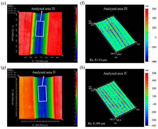 The views of machined micro-grooves (the predetermined depth of cut was 8 μm): (a) surface topography of machined micro-groove during CC; (b) surface roughness of analyzed area I; (c) surface topography of machined micro-groove during UEVC (TSR = 1/12); (d) surface roughness of analyzed area II; (e) surface topography of machined micro-groove during UEVC (TSR = 1/24); (f) surface roughness of analyzed area III; (g) surface topography of machined micro-groove during UEVC (TSR = 1/48); (h) surface roughness of analyzed area IV.