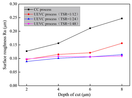 Figure 7b presents the deviations of the micro-groove depth under the different processing conditions. In the CC process, the deviation value gradually increases with the increase of the predetermined depth of the cut. The deviation value reached 20%, when the predetermined depth of the cut was 8 μm. This can be explained by the fact that the increase of the predetermined depth of the cut led to an obvious increase in cutting forces and the friction force, thus, the cutting temperature was higher, which greatly increased the level of material swelling and springback. Conversely, the deviations of the micro-groove depth in the UEVC process were smaller than 5% for all predetermined depths of the cut, and were smaller than 2% when TSR = 1/48 or TSR = 1/24. Moreover, the deviations of the micro-groove depth were smaller with the decrease of TSR. This is because the decrease of TSR could further promote the superiority of the UEVC technology, that is, smaller cutting forces and a better heat dissipation condition could be obtained with smaller TSR. Moreover, it is worth noting that, with the increase of the predetermined depth of the cut, the suppression effect of the UEVC technology on material swelling and springback was more obvious. This happened maybe due to the following reasons. In the CC process, the larger depth of the cut means larger cutting forces and a higher cutting temperature. Thus, with the increase of the predetermined depth of the cut, the material swelling and springback becomes the dominant factor in the deviation of the micro-groove depth. However, as discussed above, the effect of material swelling and springback was effectively suppressed by using the UEVC technology. This means the dominant factor in the deviation of the micro-groove depth was eliminated. Therefore, the deviation of the micro-groove depth gradually decreased with the increase of the predetermined depth of the cut.