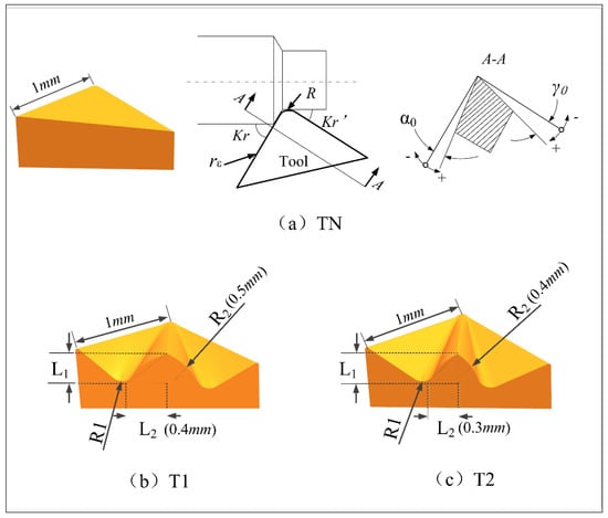 It has been found that changing the geometry of a tool could improve its cutting performance, including the geometry of the cutting edge, the geometry of the rake surface, and the micro-texture. Therefore, the structural design of tools has studied in machining. SHI et al. [7] changed the surface shape of the rake face by establishing a non-free cutting model, so the cutting deformation and chip flow of each part of the cutting edge are independent of each other when cutting, thereby increasing the chip removal capacity, allowing the chips to easily flow out from the rake face, and reducing the cutting force. Thiele et al. [8] studied the influence of tool cutting-edge geometry or edge preparation on residual stress in the hard turning of AISI52100 steel and concluded that in the precision hard turning of AISI52100 steel, the large edge hone tools produce deeper, more compressive residual stresses than small edge hone or chamfered tools. Yen et al. [9], by changing the shape of the cutting edge, studied the effects of the edge preparation of the cutting tool (round edge and chamfer edge) upon chip formation, cutting forces, and process variables (temperature, stress, and strain) in orthogonal cutting. Elbah et al. [10] studied hard turning AISI4140 steel with a wiper tool and a conventional tool and concluded that the wiper tool has better cutting performance, especially in terms of the surface roughness of the workpiece. Özel, T. [11] used 3D FE modelling to study the influence of variable edge micro-geometry of the polycrystalline cubic boron nitride (PCBN) tool on the cutting temperature during the turning of AISI4340. There are also many scholars to improve the cutting performance of the cutting tool by micro-texturing the tool’s rake surface. Zhang et al. [12] machined a micro-groove tool parallel to the main cutting edge on the rake face. When hard-hardening steel, the cutting force, friction coefficient, and surface roughness were significantly reduced compared with conventional tools. Xing et al. [13] studied the micro-scale texture of different geometric features prepared on the surface of the Al2O3/Tic ceramic tool and compared it with the cutting performance of a conventional tool in a dry cutting experiment, measuring tool wear, cutting force, cutting temperature, friction coefficient, surface roughness, and chip morphology. The results show that, compared with traditional tools, the micro-scale deformed tool significantly reduced the cutting force, cutting temperature, friction coefficient, and tool wear, and improved the surface roughness and quality of the machined workpiece. The reduction of cutting force and cutting temperature contributes to the service life of the tool and the strength of the cutting edge, which is of great significance in precision hard turning [14].