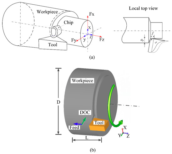 As can be seen from the typical turning geometry model in Figure 2a, the cutting force of the turning process is generated by three directions (X, Y, Z), which are the main cutting force-Fx, the radial force-Fy, and the axial force-Fz. This paper uses the AdvantEdge software (Third Wave Systems, Minneapolis, MN, USA) for turning simulation. A Model of AISI52100 hardened steel workpiece was established with a diameter D of 6 mm and a length L of 3 mm. Its chemical composition is shown in Table 3, and its physical properties are shown in Table 4. This model was then combined with the cutting tool to form the turning simulation model, as shown in Figure 2b. Among the directions, the X direction is the cutting direction, the Y direction is the cutting depth, and the Z direction is the direction of feeding.