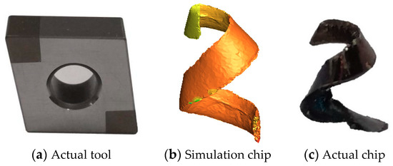 In the process of metal cutting, the shape of metal chips is often a direct reflection of the cutting effect, and the characteristics of these chips play a crucial role in surface integrity and tool state [38]. The FE simulation of the turning roller was carried out by the AdvantEdge software. The diesel engine roller was made of AISI52100 hardened steel, with a Rockwell hardness of 60 HRC. The CNC machining center used in our machining was CK0625, and the workpiece was AISI52100 hardened steel (HRC 60). The tool used in the actual test is shown in Figure 3a, and the material of the tool was Al2O3–Tic. The composition and mechanical properties are shown in Table 6. Both the actual machining and the simulation machining used the same cutting parameters: cutting speed vc = 150 m/min, feed f = 0.15 mm/r, and cutting depth ap = 0.36 mm. The chip obtained by simulation is shown in Figure 3b. As shown in Figure 3c, the chip is a spiral, unlike the experimentally obtained chip, which is basically the same as the simulation chip, thereby verifying the reliability of the simulation model.