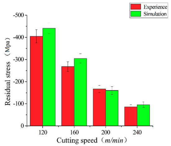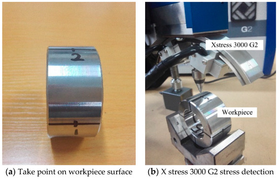 The equipment used to test the residual stress was an X stress 3000 G2, an X-ray stress tester from STRESSTECH OY, Jyväskylä, Finland. The surface of the hardened steel workpiece of the AISI52100 was divided into four points along the circumference. A point selection test was carried out, as shown in Figure 4a, and the mean value was taken after measurement. The test equipment and test procedure are shown in Figure 4. A comparison of the residual stress obtained by the simulation and the experiment is shown in Figure 5. Under different cutting conditions, the difference of residual stress is less than 15% and has good consistency.