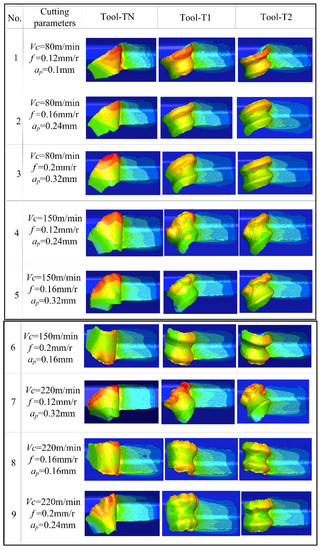 In order to compare the influence of different rake face geometries and traditional planar tools on the cutting performance of AISI52100 hardened steel, a turning test of different cutting parameters is studied in this paper. The cutting parameter test shown in Table 2 was performed using the conventional plane tool TN and the newly designed tools, T1 and T2 [30,31,32]. This test is designed for an orthogonal test design, and the L9 (34) orthogonal array is selected for the experimental design. The influences of the cutting speed vc, feed f, and cutting depth ap on the cutting performance of the different cutters are analyzed, and the number of test designs was reduced.