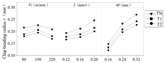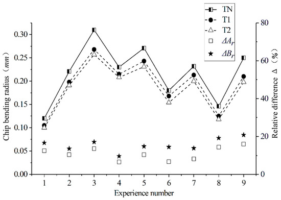 Figure 6 shows the chip morphology generated by the different cutting tools designed in this paper under different cutting parameters. According to Figure 6, compared with the traditional plane tool, the chip processed with the newly designed tools (T1 and T2) has slight bending. Radius r, which measures the chip curl, is used to indicate the degree of curling of the chips under different cutting conditions. This method is shown in Figure 7. During the process of turning machining, the contact friction between the tool and the chip causes the chip to curl and form an arc, and the inner circle measures the radius r. The measured average-bending radius of each group of test chips is shown in Figure 8, figure ΔAr, and ΔBr, respectively for the T1 and T2 tools. For the relative difference values of the tools relative to the traditional TN, the calculation formula is shown in Equation (2):