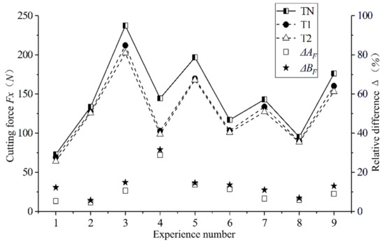 As shown in Figure 10, we conducted a comparison of the cutting force between the traditional plane tool and the newly designed curved tools under different cutting parameters. Under all cutting parameters, the cutting force of the newly designed curved tools was significantly lower than that of the conventional plane tool. Figure ΔAF and ΔBF, respectively, for the T1 and T2 tools, show the difference value of the tools relative to the traditional TN. The calculation formula is shown in Equation (3):