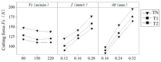 According to the single factor influence of the cutting parameters in Figure 11, the cutting speed has little influence on the cutting force, while the cutting depth ap and the feed f have great influence on the cutting force, which increases with an increase in cutting depth and feed. This result is due to the increased contact area of the tool–chip interface as the feed rate and depth of cut increase. This increases the friction between the chip and the rake face of the tool, resulting in an increase in cutting force.