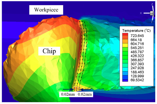 This FE model adopts adaptive mesh generation technology, and the mesh density of the cutting area is relatively large near the plastic deformation area, while the mesh density of the other areas is relatively small, so a better cutting area grid is obtained. The maximum unit size of the workpiece is 1 mm, and the minimum unit size is 0.15 mm. The minimum unit side length of the cutting edge is 0.01 mm, and the radius of refined region of the cutting edge is 0.05 mm. In order to better observe the variation and contrast of the chip’s morphology, the minimum unit’s side length for the chip is 0.01 mm, and the chip’s refinement factor is 3.
