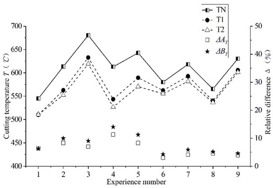 For studying the influence of the surface of the newly designed curved tool on the temperature of the processed surface, the cutting temperature of 60 points on the processed surface were extracted. This extraction method is shown in Figure 12, and the mean value was taken as the cutting temperature of the processed surface. Three measurements were taken for each machined surface, and the average temperature was calculated. The influence of the different curved tools on the cutting temperature is shown in Figure 13. It can see that under all cutting parameters, the cutting temperature of the newly designed curved tool is smaller than that of the conventional plane tool. Figures ΔAT and ΔBT, respectively, for the T1 and T2 tools show the difference value of the tool relative to the traditional TN. The calculation formula is shown in Equation (4):