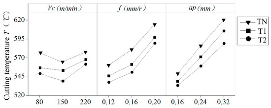 The single factor effect of the cutting parameters on cutting temperature can see in Figure 14. The depth of the cut and the amount of feed f have a great influence on the cutting temperature, which is consistent with the conclusions drawn by Bouacha et al. [15]. Moreover, the cutting temperatures of the three tools increase with an increase in the feed rate and depth of the cutting. This shows that when the cutting amount is small, the influence on the cutting temperature is also small, and when the cutting amount increases, the influence also increases. The curved surface design of the rake face also has a great influence on the cutting temperature.