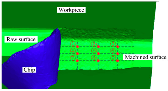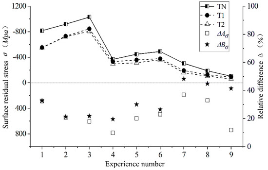 Residual stress on the surfaces of the parts after cutting is mainly caused by plastic deformation (extrusion and tensile), thermoplastic deformation, and phase change stress [40]. The influence of the newly designed T1 and T2 tools on the surface residual stress of the AISI52100 hardened steel workpiece under different cutting parameters was studied and compared with the traditional plane tool. The residual stress value of the machined surface was obtained through simulation. As shown in Figure 15, nine test points were obtained by dividing three lines horizontally and longitudinally on the machined workpiece surface, the residual stresses of the these points were selected, and the averages were taken as the residual stresses of the machined surface. The test results are shown in Figure 16. Figure ΔAσ and ΔBσ respectively for the T1 and T2 tools show the difference value of the tool relative to the traditional TN. The calculation formula is shown in Equation (5):