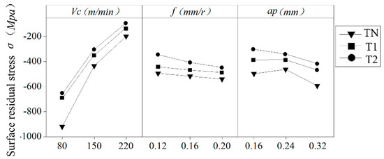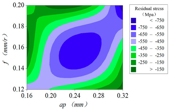 This paper not only considers the influence of a single factor on residual stress but also considers the influence of cutting parameter interactions on residual stress. Figure 17 shows the influence of the single factor cutting speed vc, feed f, and depth of cutting ap on residual stress. The cutting speed has a great influence on the surface residual stress, and its value decreases with an increase of its cutting speed. However, f and ap have little influence on residual stress, which decreases slightly with an increase in feed and cutting depth. According to the interaction diagram in Figure 18, the residual stress first rises and then declines with an increase in feed and cutting depth, forming a peak when the feed is 0.16 mm/r and the cutting depth is 0.24 mm. The residual stress on the surface of the AISI52100 hardened steel is turned by different cutting parameters with different cutters, and the residual compressive stress is generated on the surface of the workpiece. With an increase of the cutting speed, the residual stress on the surface decreases. This is because the surface temperature of the workpiece decreases while the cutting speed increases, thereby reducing the residual stress caused by thermal stress. With the increase of feed, the residual stress of the machined surface decreases, which is caused by the reduction of mechanical stress and plastic deformation. The residual compressive stress produced by the surface can improve the fatigue life of the material. Therefore, in order to improve the surface quality of the AISI52100 hardened steel in hard turning, it is also necessary to consider the cutting parameters.