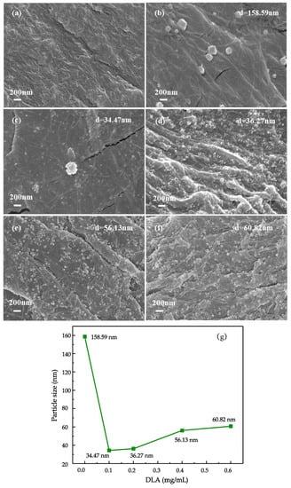 The SEM images of (a) bhpFibers and bhpFibers@AgNP-based paper prepared by 20 mM AgNO3 and different concentrations of DLA: (b) 0 mg/mL, (c) 0.1 mg/mL, (d) 0.2 mg/mL, (e) 0.4 mg/mL and (f) 0.6 mg/mL; (g) silver particle sizes at different concentrations of DLA.
